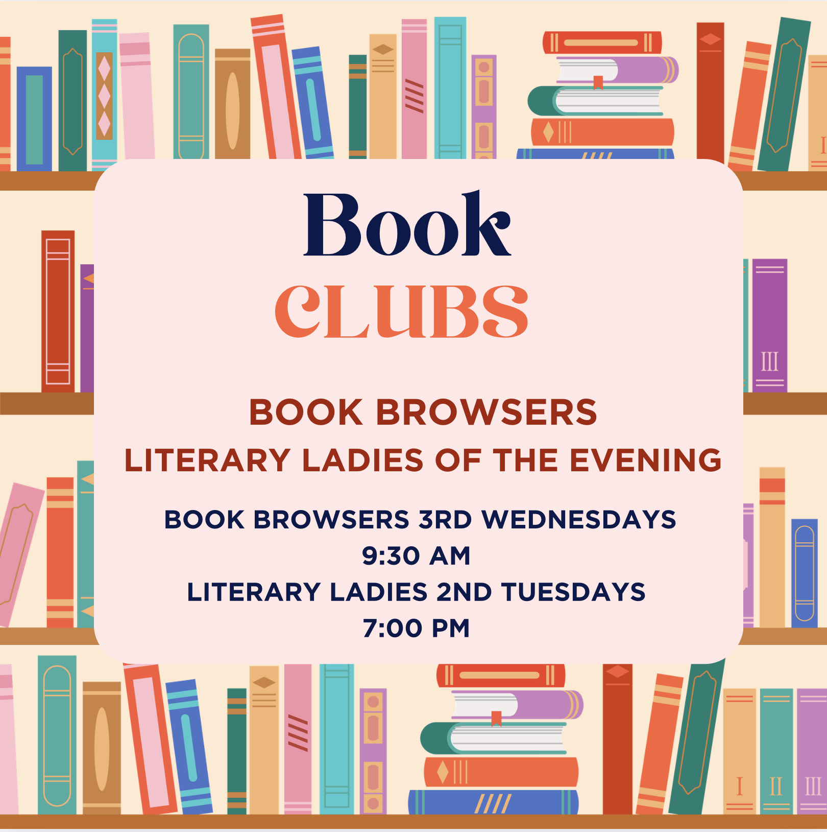 Have the urge to let everyone know about the latest literary masterpiece that stimulated your intellectual mind? Participate in a fun filled breakfast or an evening appetizer selection followed by a group discussion of our monthly book. Please use the sign-up sheet above to receive an invitation. You can join anytime—whether you read the assigned book or not! Book Browsers meets on 3rd Wednesdays, 9:30 am and Literary ladies meets at 7:00 pm on the 2nd Tuesday of the month.